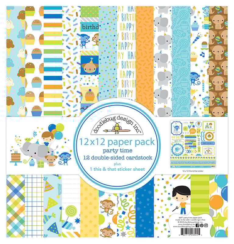 You will find the perfect papers for his birthday celebration in the Party Time Collection 12" x 12" Paper Pack by Doodlebug Design. The package includes 12 double sided pattern papers and one 12" x 12" sheet of cardstock stickers. You will love all the images of puppies, cupcakes, elephants, sprinkles, bon bon's, lollipops, and more. Made in the USA.
