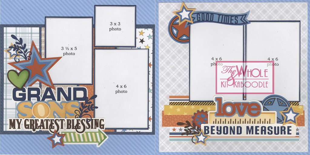 Get ready to celebrate the grandsons (or sons, or great-grandsons!) who steal your heart with this clever, adaptable scrapbook page kit. Why buy multiple kits when one does it all? Simply remove the "s" if you're documenting one special grandson, raid your craft stash to add "great" for those wonderful great-grandsons, or drop "grand" entirely to create pages honoring your own sons.